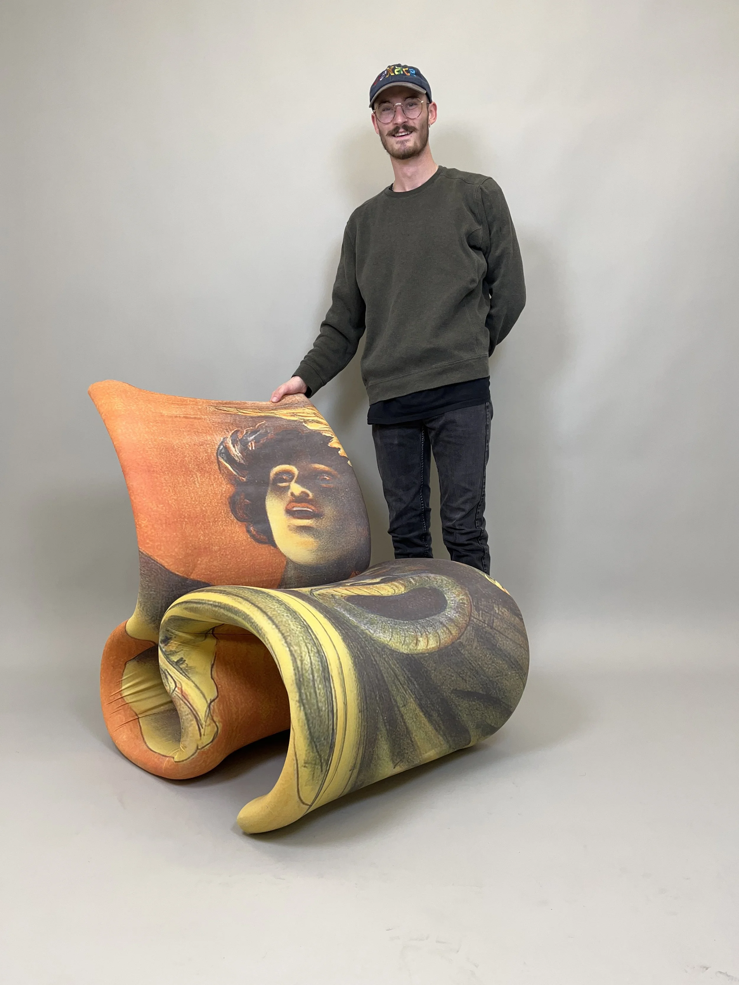 The chair is currently for sale and we are able to have any image laminated on top (such as the French painting shown above). Or, if a solid color is what you’d prefer, we can have just the neoprene exposed. Either way, it is an extremely comfortable chair and I’m very proud of the work and effort put into it.